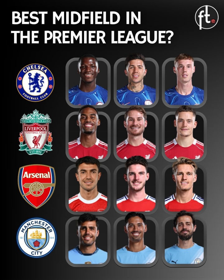 切尔西:凯塞多、恩佐、帕尔默利物浦:赫拉芬贝赫、麦卡利斯特、维尔茨阿森纳:苏维门迪、赖斯、厄德高曼城:罗德里、赖因德斯、B席...