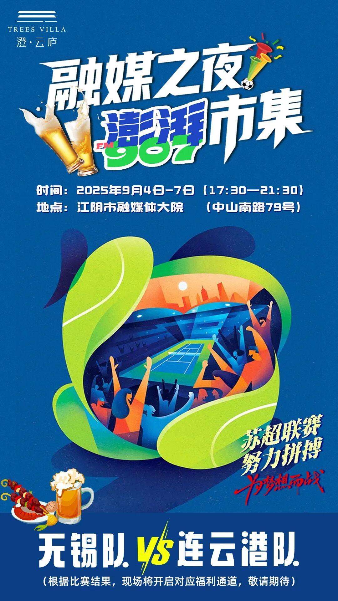 苏超市集畅爽狂欢宴 一起融媒看球赛融媒之夜·澎湃市集2025澄云庐无锡队 VS 连云港队上次没玩够?这次更精彩!江阴市融媒体中心(中山南路79号)9月4日——9月7日(17:30—21:30)一起为苏超呐喊!市集回归!夏末初秋,凉风有信,由江阴城发澄云庐独家冠名的【融媒之夜·澎湃市集】重磅...